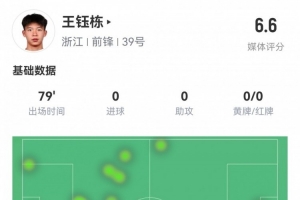 體育資訊3月1日訊 正在進(jìn)行的中超第二輪,云南玉昆主場暫1-1浙江隊。此役浙江隊國青小將王鈺棟首發(fā)登場79分鐘被換下,球員全場重點數(shù)據(jù)如下↓
