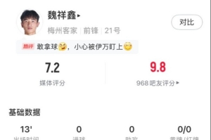 體育資訊3月1日訊 中超第2輪,梅州客家擊敗河南隊(duì),16歲國少前鋒魏祥鑫替補(bǔ)迎來中超首秀,他登場13分鐘,獲評(píng)7.2分。