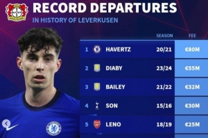 體育資訊3月2日訊 《轉(zhuǎn)會市場》統(tǒng)計(jì)了勒沃庫森隊(duì)史賣人最貴榜,哈弗茨以8000萬歐元居首。