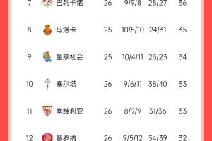 馬競(jìng)先賽登頂,領(lǐng)先未賽的巴薩2分?;蜀R近五輪僅1勝,掉至第三。