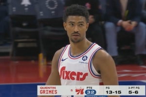 目前比賽進(jìn)行到第三節(jié),76人球員格萊姆斯?fàn)顟B(tài)火熱,已經(jīng)15中13,三分球6中5,罰球1中1,砍下賽季新高的32分,此前最高分為30分。