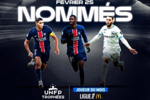 體育資訊3月2日訊 法甲官方公布法甲2月最佳球員候選,登貝萊、阿什拉夫、古伊里入選。