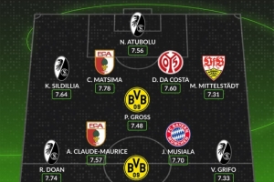 前鋒:堂安律(弗賴堡,7.74分)、吉拉西(多特,7.55分)、格里福(弗賴堡,7.33分)
