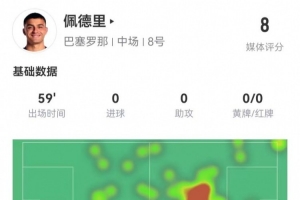 體育資訊3月3日訊 巴薩在本輪西甲4-0領(lǐng)先皇社,佩德里本場數(shù)據(jù)如下:
