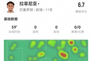 體育資訊3月3日訊 巴薩在本輪西甲4-0領(lǐng)先皇社,拉菲尼亞本場數(shù)據(jù)如下: