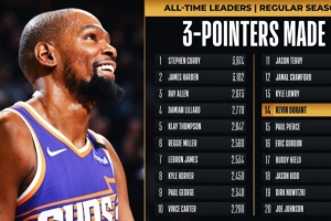 比賽首節(jié),杜蘭特命中一記高難度壓哨三分,生涯常規(guī)賽三分命中數(shù)達(dá)到2144記,超越皮爾斯獨占?xì)v史第14位。