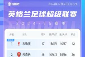 體育資訊12月30日訊 本輪英超曼城2-0萊斯特城,最新英超積分榜如下。