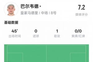 體育資訊3月5日訊 歐冠1/8決賽首回合,皇馬主場迎戰(zhàn)馬競,巴爾韋德出任首發(fā)右后衛(wèi),半場貢獻1次助攻,送出1次關(guān)鍵傳球,還有2解圍和4攔截,評分7.2。