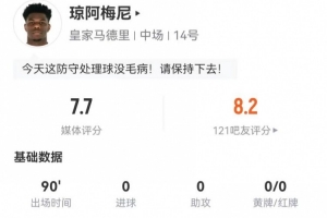 體育資訊3月5日訊 皇馬在本輪歐冠2-1擊敗馬競,瓊阿梅尼本場數(shù)據(jù)如下: