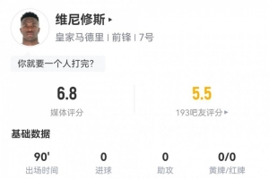體育資訊3月5日訊 歐冠1/8決賽首回合,皇馬主場2-1馬競。此役維尼修斯首發(fā)打滿全場,球員全場重點(diǎn)數(shù)據(jù)如下↓