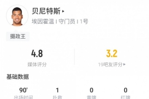 本場比賽,埃因霍溫門將貝尼特斯面對阿森納的8次射正,丟掉了7球。本場比賽貝尼特斯唯一一次撲救,是面對恩瓦內(nèi)里的一條龍↑