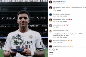 羅德里戈在賽后被歐冠官方評為本場最佳球員,他也通過社媒曬出自己手捧獎杯的照片,并配文:“特別的夜晚!我愛這樣的時刻!??????歐冠”