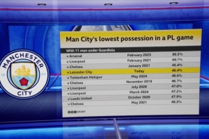 體育資訊12月30日訊 英超第19輪比賽,曼城客場2-0擊敗萊斯特城。據BBC統計,此役曼城控球率46.4%,這是瓜帥上任以來曼城在11人情況下控球率第4低的英超比賽。