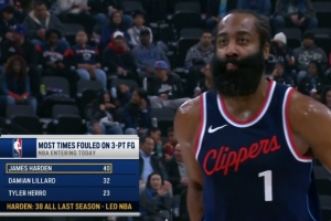 本場比賽之前,快船后衛(wèi)哈登保持著自己在外線的殺傷力,40次三分被犯規(guī)領跑全聯(lián)盟。