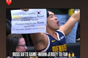 今天,一位來自韓國的球迷現(xiàn)場舉牌觀戰(zhàn),牌子上寫道:“這是我第四次跋涉6000英里(1英里≈1.61公里、6000英里≈9660公里)來看你,威少。不管你在哪里,我都會支持你。你的頭號粉絲。PS:2025年NBA總冠軍=丹佛掘金。”