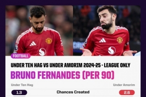 B費(fèi)本賽季英超每90分鐘關(guān)鍵數(shù)據(jù):滕哈赫時(shí)代→阿莫林時(shí)代
