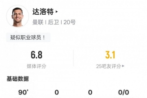 體育資訊3月7日訊 歐聯(lián)杯1/8決賽首回合,曼聯(lián)客場(chǎng)1-1皇家社會(huì)。達(dá)洛特首發(fā)出戰(zhàn),送出2次關(guān)鍵傳球,4次爭頂成功全場(chǎng)最多,但也有21次丟失球權(quán),評(píng)分6.8。