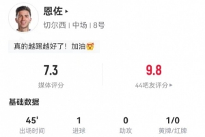 體育資訊3月7日訊 切爾西在本輪歐協(xié)聯(lián)2-1擊敗哥本哈根,恩佐本場數(shù)據(jù)如下: