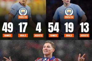 2023/24賽季(曼城):54場(chǎng)19球13助;