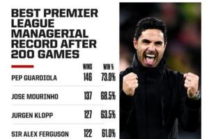 阿爾特塔的英超200場(chǎng)勝率是59.3%,在英超歷史中位列第五位。