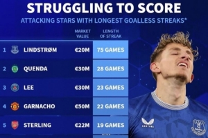體育資訊3月8日訊 《轉會市場》統(tǒng)計了當前身價超過2000萬歐元的攻擊手當前進球荒情況,林德斯特倫斷崖式居首。