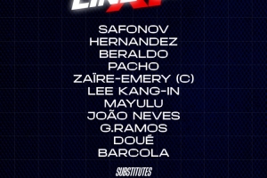 替補(bǔ):1-多納魯馬、3-金彭貝、2-阿什拉夫、25-門德斯、17-維蒂尼亞、8-法比安、49-姆巴耶、10-登貝萊、7-克瓦拉茨赫利亞