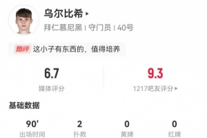 體育資訊3月9日訊 拜仁在本輪德甲2-3不敵波鴻,小將烏爾比希德甲首秀數(shù)據(jù)如下:
