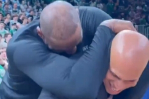 賽前,現(xiàn)ESPN解說員、前NBA球員理查德-杰弗森正在工作,詹姆斯從身后發(fā)動“偷襲”,兩人親密互動了一波。