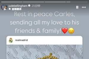 皇馬中場貝林厄姆更新社媒悼念卡萊斯,配文:“R.I.P.卡萊斯,向他的家人朋友致以我所有的愛。”