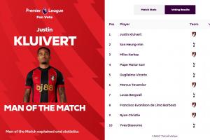 本場比賽伯恩茅斯前鋒小克魯伊維特發(fā)揮出色,送出一次助攻,賽后他也以超過50%的得票率當(dāng)選英超官方球迷票選全場最佳球員。