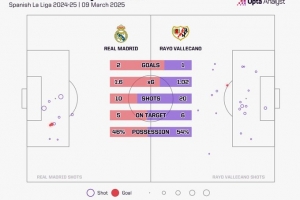 OPTA統(tǒng)計表明,本場比賽巴列卡諾有20次射門,而皇馬只有10次,這是除了面對巴薩之外,皇馬自2008年1月以來在西甲主場與對手最大的射門次數(shù)差。