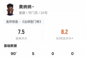 體育資訊3月10日訊 英超第28輪焦點(diǎn)戰(zhàn),曼聯(lián)1-1阿森納。奧納納首發(fā)出戰(zhàn),貢獻(xiàn)5次撲救全場(chǎng)最多,但丟失25次球權(quán)也是全場(chǎng)最多,評(píng)分7.5。