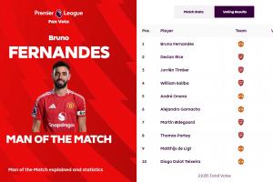 本場(chǎng)比賽,B費(fèi)打入一個(gè)任意球世界波,為曼聯(lián)首開記錄,賽后他獲得50%的票數(shù),被評(píng)為全場(chǎng)最佳。