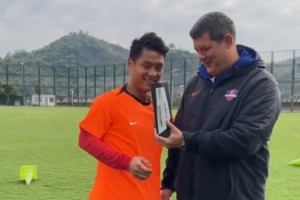 梅州客家隊(duì)的訓(xùn)練中,特意為楊超聲舉辦了一個(gè)有趣的領(lǐng)獎(jiǎng)儀式,隊(duì)友們分列兩旁,楊超聲從中穿過(guò),接受了隊(duì)友們的“祝賀”。