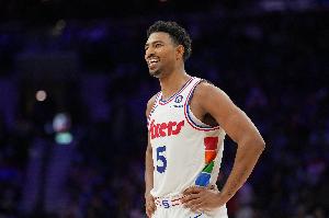 76人球員格萊姆斯本場比賽打得不錯,最后時刻爵士采用犯規(guī)戰(zhàn)術(shù)時他罰球穩(wěn)健4罰全中。