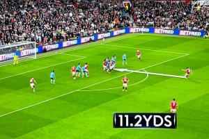 而賽中的轉(zhuǎn)播鏡頭也刻意給出了數(shù)字,鏡頭顯示,B費(fèi)的罰球點(diǎn)距離阿森納的人墻足足有11.2碼(約為10.24米),而規(guī)則要求的人墻與罰球點(diǎn)距離一般只有10碼(9.15米)。