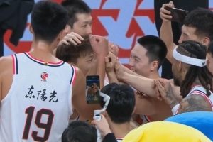 比賽結(jié)束后,場上出現(xiàn)了很溫馨的一幕,廣東隊的隊員們將趙睿圍在中間,大家將拳頭碰在一起,寒暄說笑。
