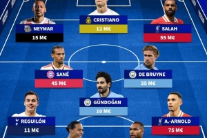 前鋒:內馬爾(桑托斯,1500萬歐)、C羅(利雅得勝利,1200萬歐)、薩拉赫(利物浦,5500萬歐)