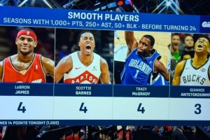 根據(jù)數(shù)據(jù)統(tǒng)計,加上本場比賽,斯科蒂-巴恩斯本賽季的得分已經(jīng)突破1000分。生涯至今他已經(jīng)4次做到單賽季得分1000+助攻250+蓋帽50+,他追平詹姆斯和麥迪,成為25歲前單賽季得分1000+助攻250+蓋帽50+次數(shù)最多的球員。