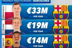 巴薩隊(duì)內(nèi)年薪前五:(單位/歐元)