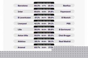 Opta預(yù)測歐冠1/8決賽次回合勝率: