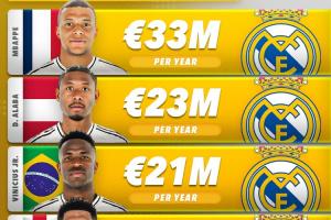 皇馬隊內(nèi)年薪前五:(單位/歐元)