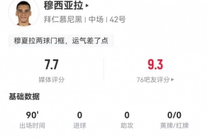 體育資訊3月12日訊 拜仁在本輪歐冠2-0力克勒沃庫森,穆西亞拉本場數(shù)據(jù)如下: