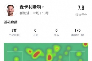 體育資訊3月12日訊 利物浦在本輪歐冠0-1落后巴黎,麥卡利斯特本場(chǎng)數(shù)據(jù)如下:
