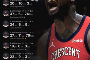 據(jù)統(tǒng)計(jì),錫安在過(guò)去10場(chǎng)出戰(zhàn)的比賽中場(chǎng)均可以得到25.2分7.3籃板6.0助攻,他在291分鐘的出場(chǎng)時(shí)間里得到了252分。