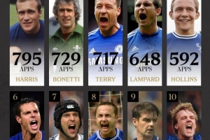 體育資訊3月12日訊 切爾西俱樂部成立120周年,球隊官方社媒曬截至目前球員代表球隊出場次數(shù)榜,羅恩-哈里斯第一,特里第三,蘭帕德第四,AZP第六,切赫第七。