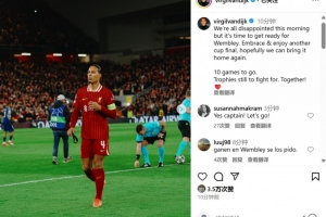 范迪克也在社媒發(fā)文寫道:“今天早上我們每個人都很失望,但現(xiàn)在是時候為溫布利球場的決賽做好準(zhǔn)備了。擁抱并享受又一場決賽,希望我們能再次把獎杯帶回家。賽季還剩10場比賽,還要為冠軍而拼搏。我們一起加油!”