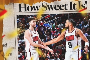 賽后火箭官方曬出本場贏球海報,狄龍和申京登上封面。
