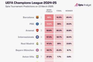 體育資訊03月13日訊 歐冠1/8決賽全部結(jié)束,opta也更新了最新的歐冠奪冠概率,其中巴薩以20.4%領(lǐng)跑,巴黎、阿森納分列二三,國(guó)米、皇馬和拜仁位列第4、第5和第6。