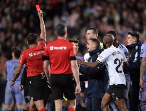 在2024年3月,皇馬2-2戰(zhàn)平瓦倫西亞最后時(shí)刻,貝林厄姆破門,但主裁提前吹響終場哨?;蜀R集體抗議,貝林厄姆對(duì)裁判出言不遜,被主裁判希爾-曼薩諾直紅罰下。